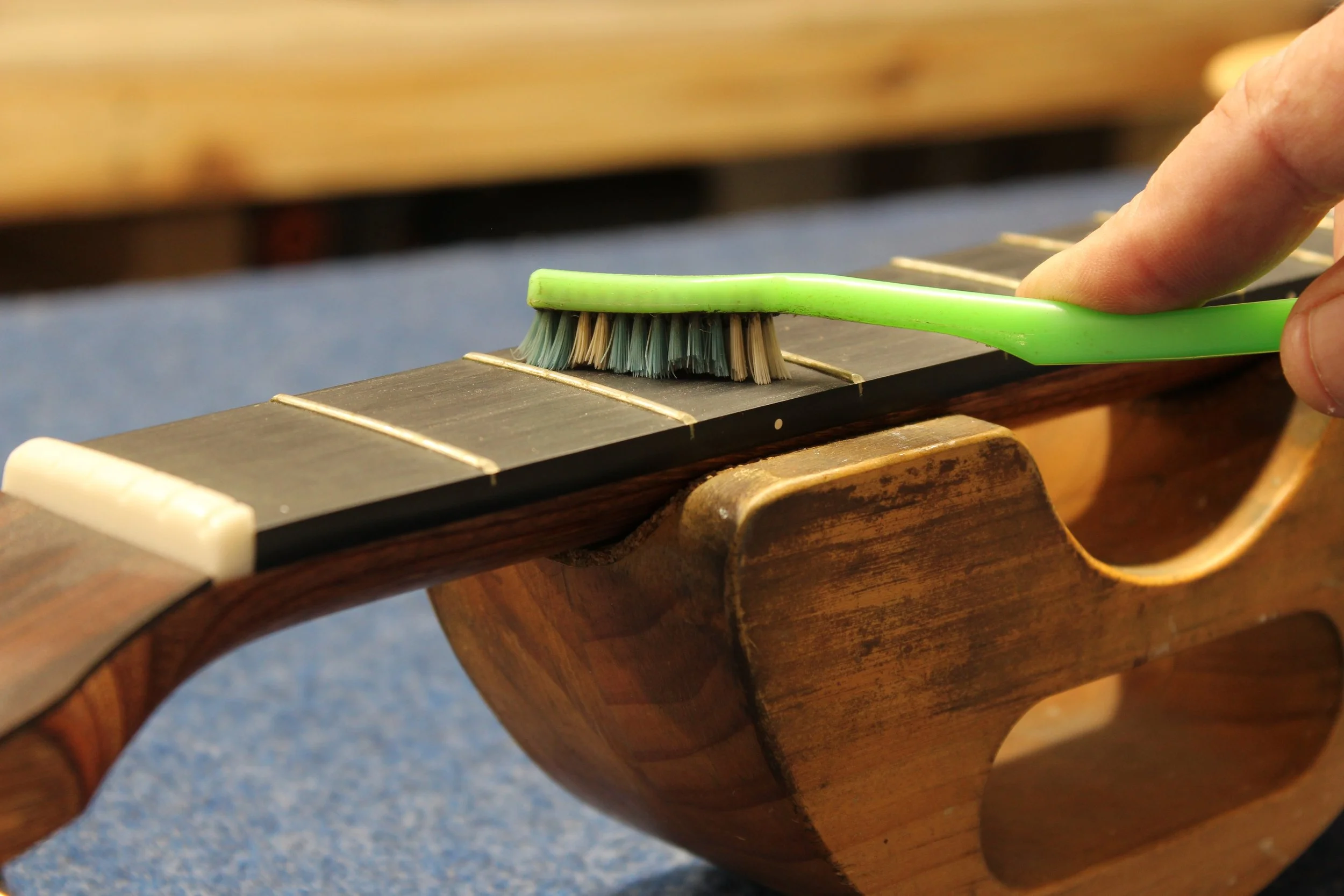 Thoroughly clean and condition the fretboard. Smooth and polish frets to a brilliant shine.