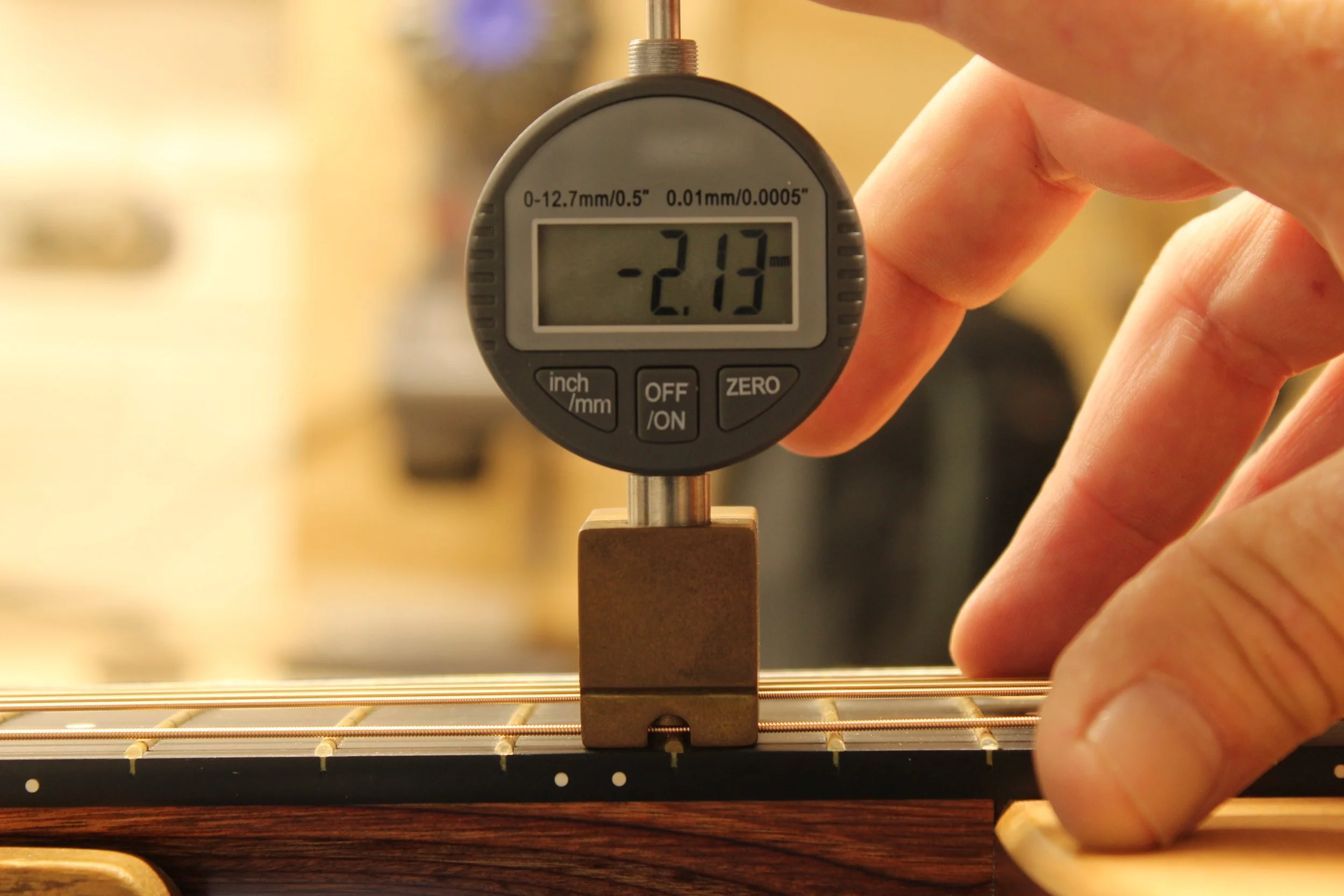 Fit fresh strings, set neck relief, adjust action if required, and inspect the nut to ensure correct slot depth.