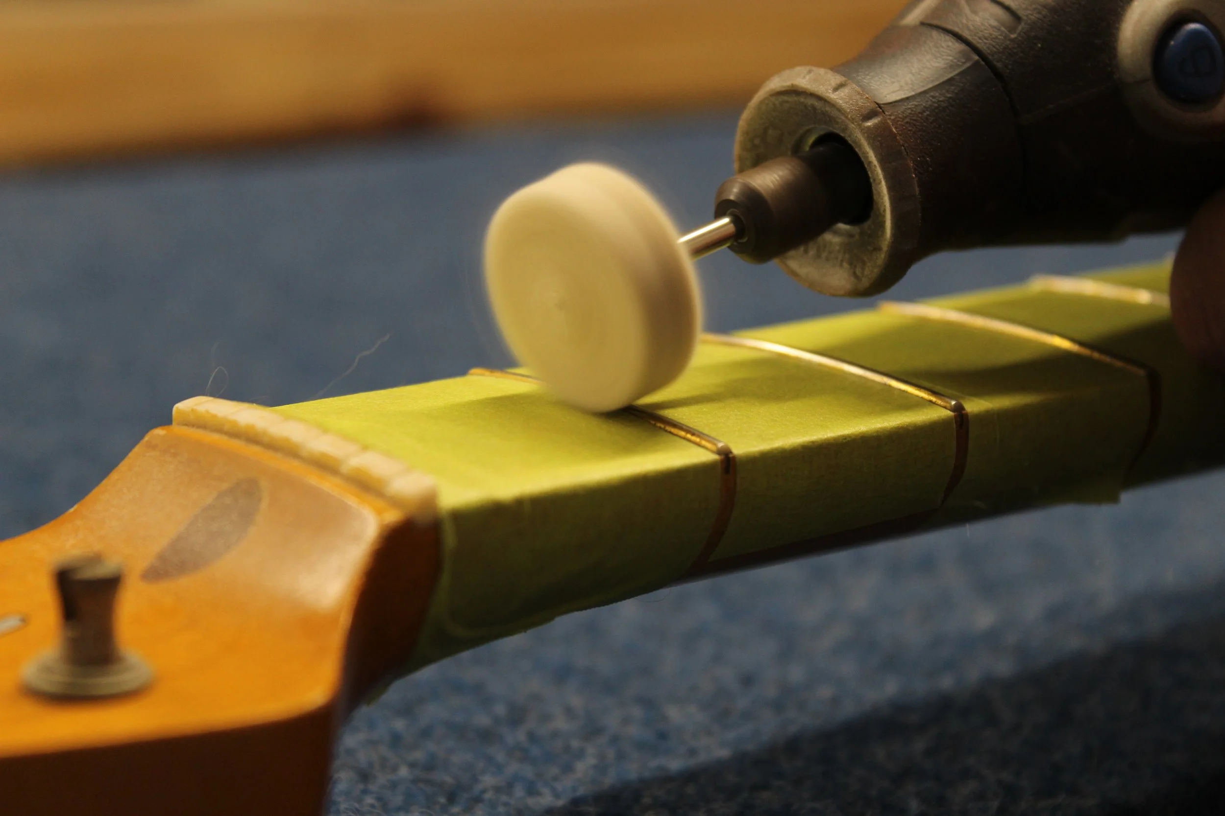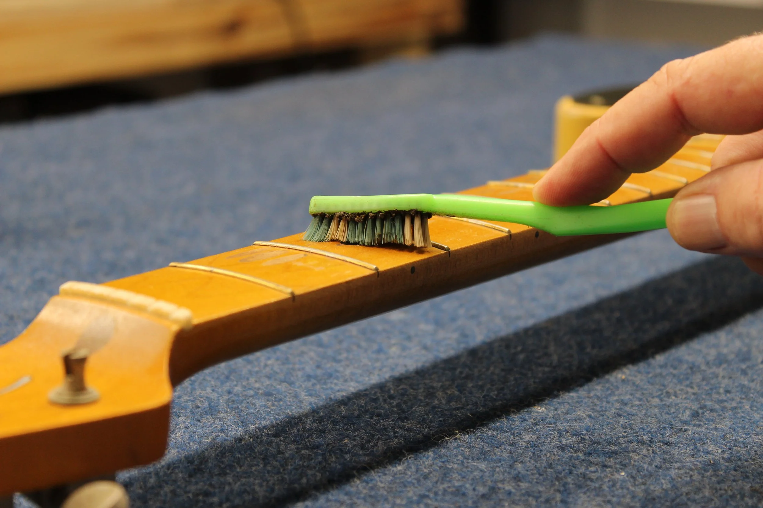 Thoroughly clean and condition the fretboard. Smooth and polish frets to a brilliant shine.